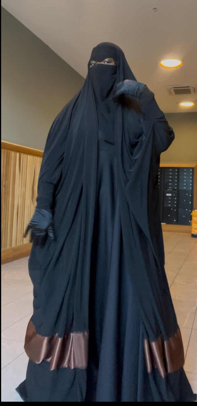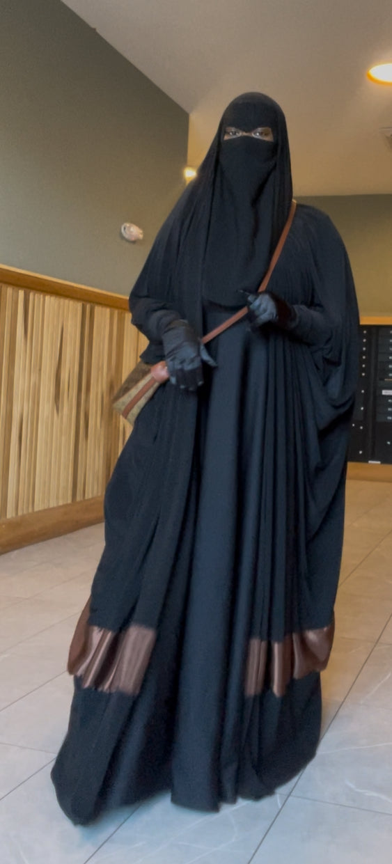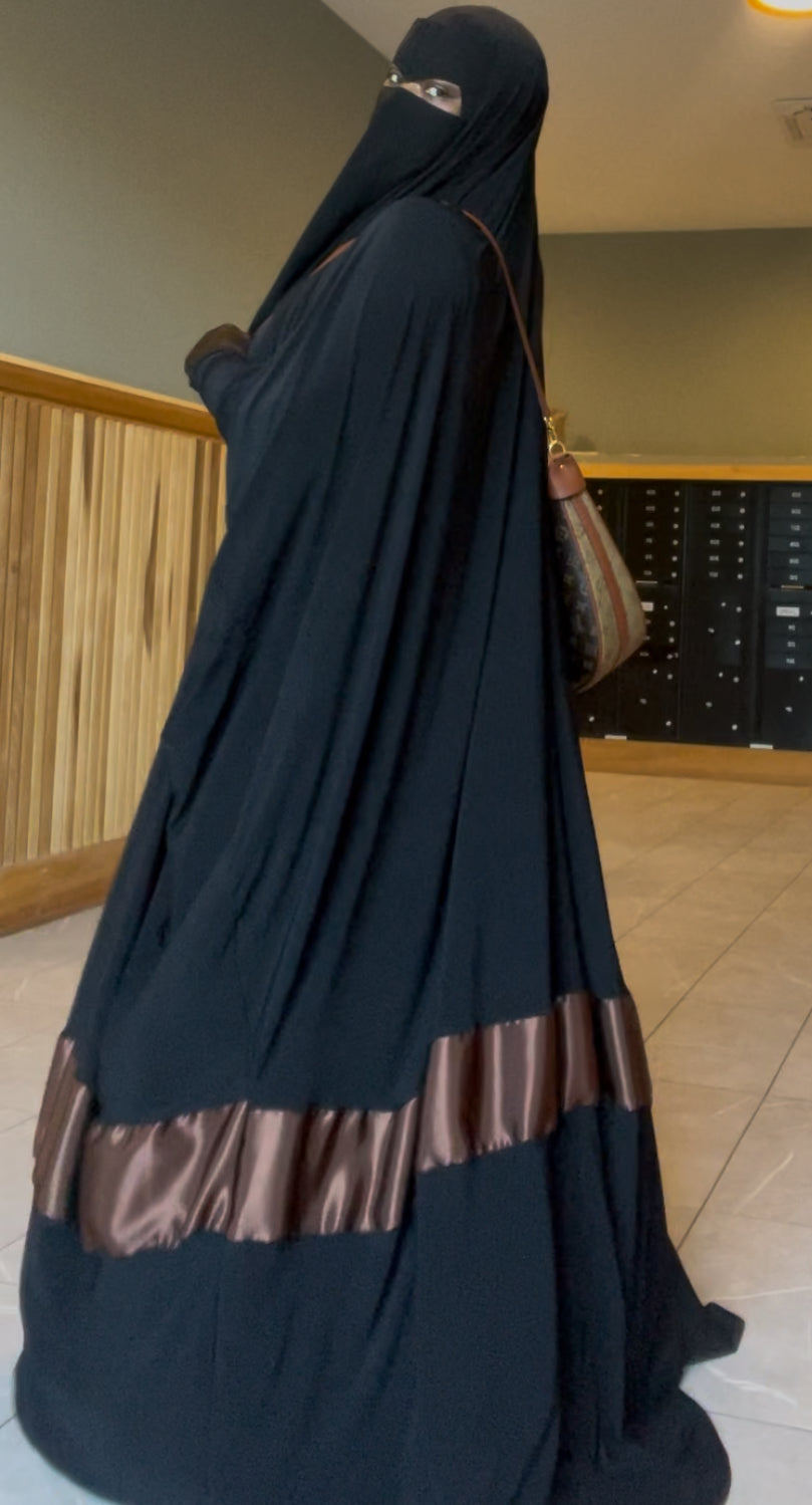 This overhead is open with fitted cuffs, elastic to hold in place on your head.