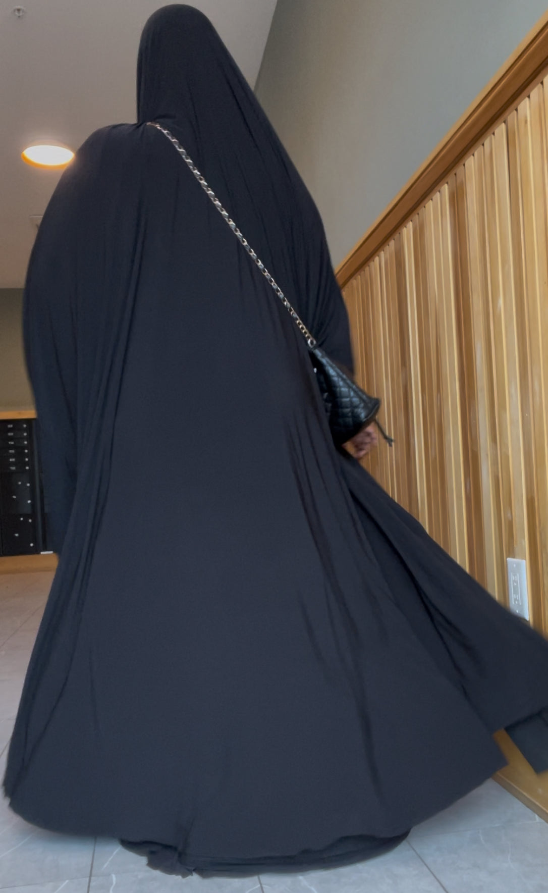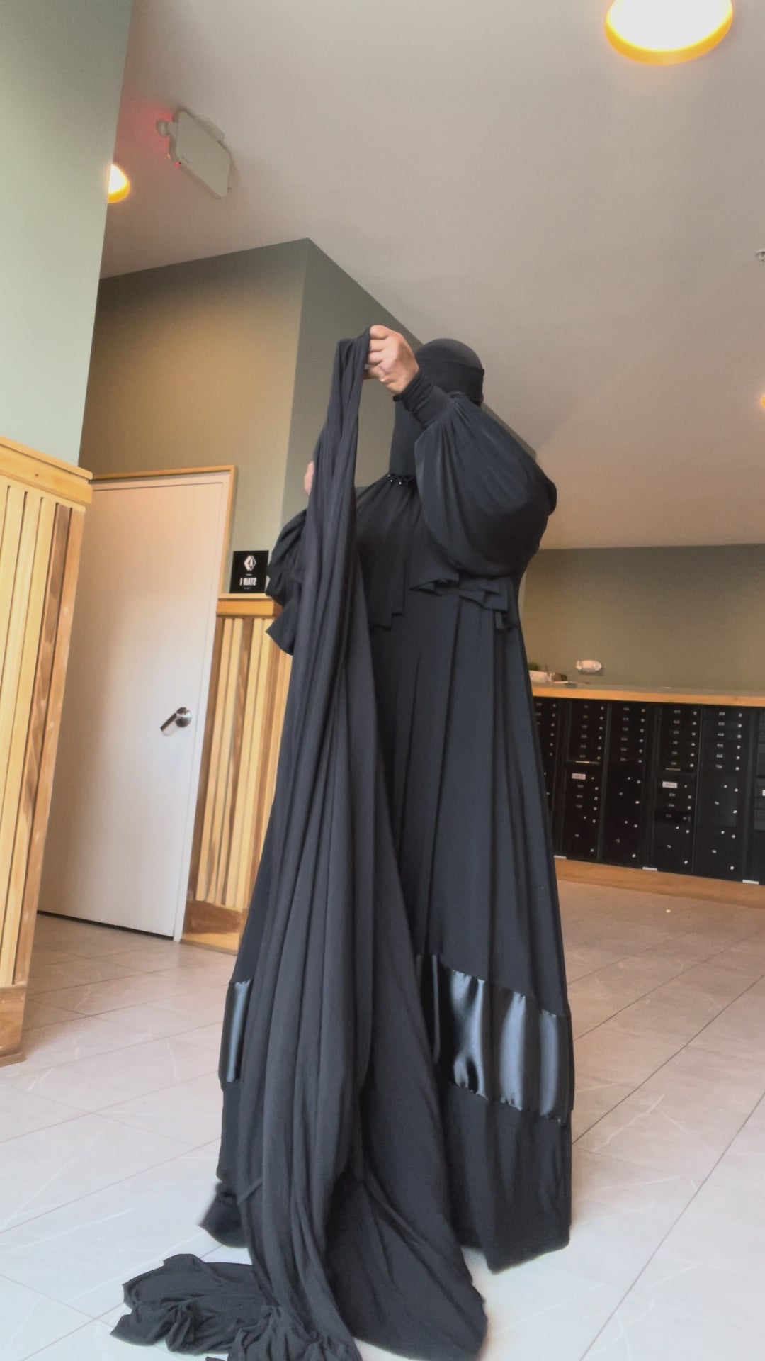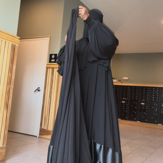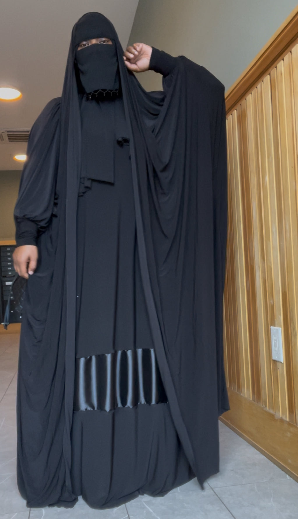 This overhead is open with fitted cuffs, elastic to hold in place on your head.